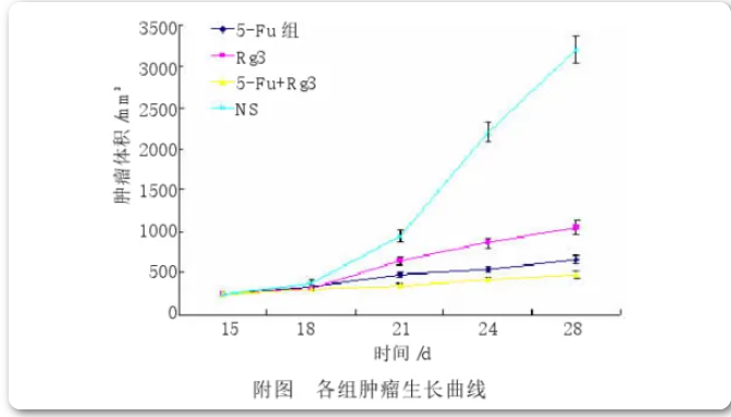 肿瘤细胞植入皮下后第15天,将裸鼠称重后用随机数字表法分成4组(每组10只),人参皂苷Rg3组:0.5mL浓度为5mg/kg的人参皂苷Rg3灌胃,每日1次;5-Fu组:0.5mL浓度为20mg/kg的5-Fu,腹腔内注射,每3天1次;5-Fu和人参皂苷Rg3联合组:0.5mL浓度为5mg/kg的人参皂苷Rg3联合20mg/kg的5-Fu,其中人参皂苷Rg3灌胃,每日1次,5-Fu腹腔内注射,每3天1次;对照组:0.5mL的0.9%氯化钠注射液灌胃,每日1次。各组用药时间均为4周。