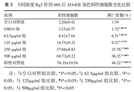 见表3,图1。AO-EB染色显示:空白对照组结构形态饱满,结构清晰,表现出均匀绿色的荧光。随着Rg3剂量的加大,荧光显微镜下凋亡细胞数增加,表现为:细胞核体积缩小,核固缩,凋亡小体形成,大量细胞碎片,细胞膜被染成红色(图1)。由表3可见,用药各组间两两比较差异有统计学意义(P<0.05)。