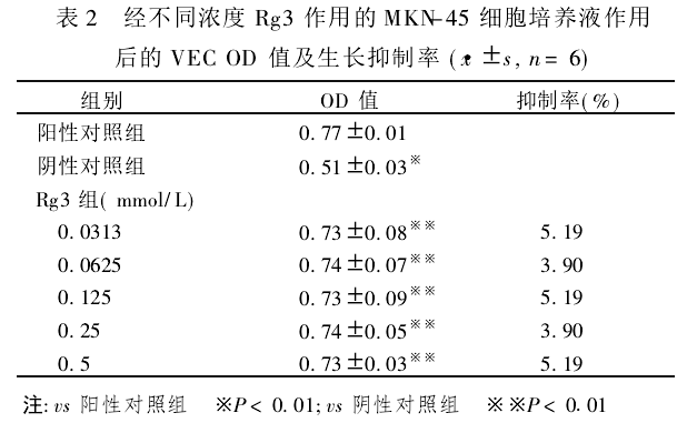 经不同浓度Rg3作用后的胃癌MKN-45细胞条件培养液与VEC作用的OD值及抑制率见表2。阳性对照组OD值与阴性对照组差异有显著性(P<0.01);经不同浓度Rg3处理的MKN-45细胞条件培养液作用的VEC OD值与阳性对照组差异均无显著性(P>0105),与阴性对照组差异均有显著性(P<0.01)。