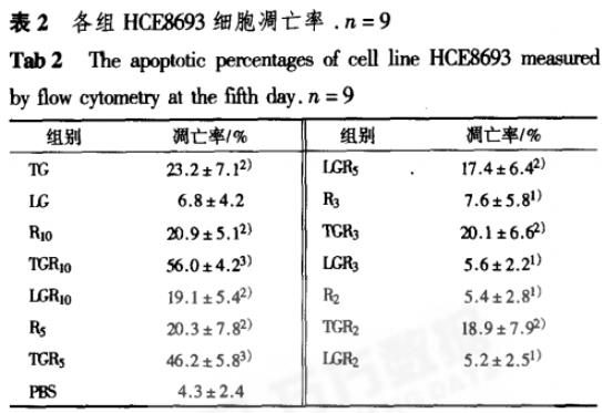 各组HCE8693细胞凋亡率见表2。TG,TGR3,TGR2组与LG,LGR3,LGR2组比较有统计学差异,说明TRAIL基因与阴性对照组中的LacZ基因相比对HCE8693细胞的凋亡有明显的促进作用;TG,R10,LGR10,R5,LGR5,TGR3,TGR2各组间比较无统计学差异,但凋亡率以TG组为最高,说明Rg3在较高浓度时对HCE8693细胞的凋亡有促进作用;TGR10,TGR5组与其他各组生长凋亡率的比较有显著差异,说明TRAIL与Rg3联合应用后对HCE8693细胞的促凋亡有协同作用。