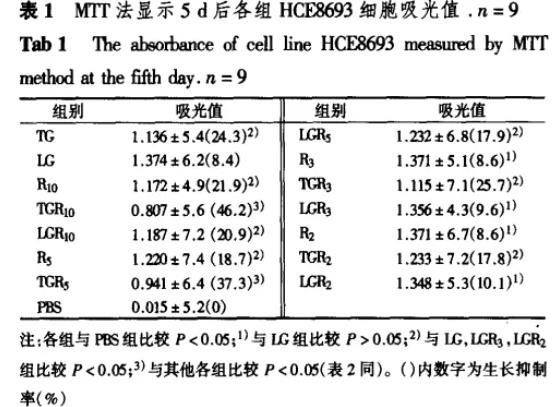 MIT法显示第5天各组HCE8693细胞生长抑制率比较见表1。TG,TGR3,TGR2组与LG,LGR3,LGR2。组比较有统计学差异,说明TRAIL基因与阴性对照组中的LacZ基因相比对HCE8693细胞的生长有明显抑制;TG,R10,LGR10,R5,LGR5,TGR3,TGR2各组间比较无统计学差异,但抑制率以TG组为最高,说明Rg3在较高浓度时对HCE8693细胞的生长有抑制作用;TGR10,TGR5组与其他各组生长抑制率的比较有显著差异,说明TRAIL与Rg3联合应用后对HCE8693细胞的生长抑制有协同作用。