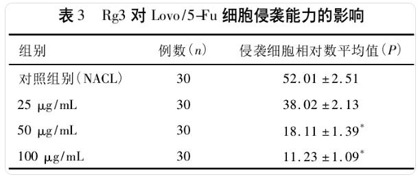 Rg3作用后,Lovo/5-Fu细胞侵袭能力明显降低,中、高浓度Rg3组比较对照组穿膜的细胞数明显减少(P<0.05),见表3。