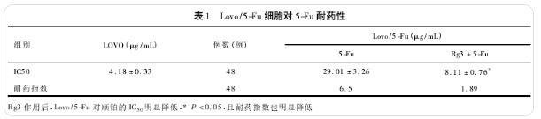 应用MTT法检测Rg3的IC50值,结果显示:Rg3对Lovo/5-Fu细胞的IC50值为53.01μg/mL,Lovo/5-Fu细胞的耐药指数在5-Fu组为6.5,而在Rg3+5-Fu组为1.89,耐药指数明显降低。见表1。