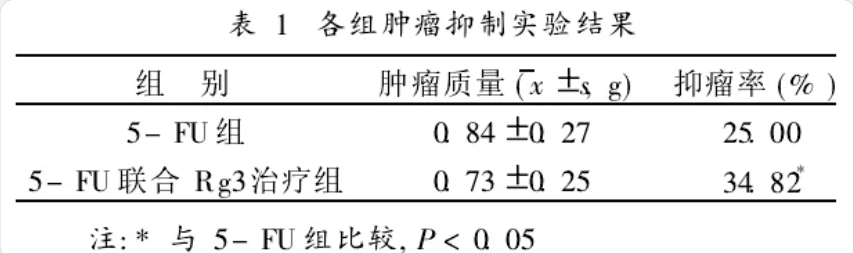5-FU组能够产生抑制肿瘤生长的效果,其抑瘤率为25.00%;而5-FU及Rg3联合治疗组的抑瘤率则达到了34.82%,两组抑瘤率进行比较有明显差异(P<0.05)。其结果见表1。